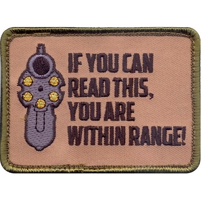 Nášivka s nápisem IF YOU CAN READ THIS, YOU ARE WITHIN RANGE! (překlad "jestli tohle dokážeš přečíst, jsi v dostřelu") na suchém zipu. Rozměr 6 x 9 cm.