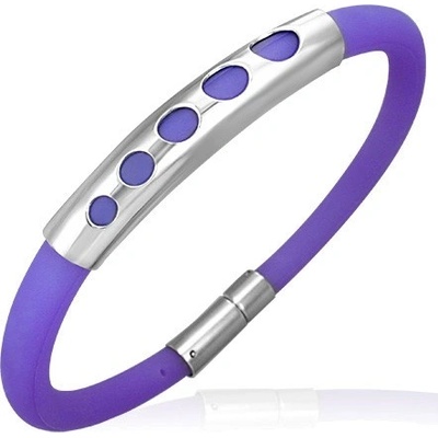 Gumový náramek ve fialové barvě, postupně se zvětšující kruhy na kovové části.