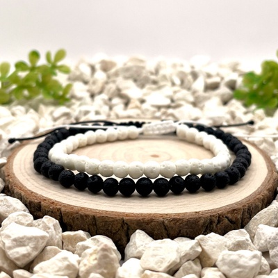 Provázkové náramky v kontrastu světlé a tmavé Provázkové náramky z bílé a černé lávy spojují přírodní materiály s čistým, minimalistickým designem. Jemné korálky o velikosti 4...