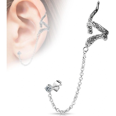 Ocelová náušnice s řetízkem a klipsem na ušní boltec Horní část náušnice je tvořena stočeným hadem Materiál náušnice: chirurgické oceli 316L a rhodiovaná bižuterie OP1003