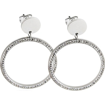 Kruhové naušnice zn. EXEED osazené čirými kameny. Kombinace leštěné a broušené povrchové úpravy. Průměr kruhu 3 cm. Šířka: 0,7 cm.