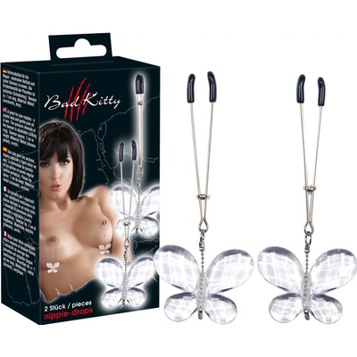 Svorky na bradavky BUTTERFLY s průhlednými motýlími přívěsky z kolekce BAD KITTY jsou vyrobeny z pochromovaného kovu a akrylu. Svorky jsou chráněny PVC potahem, aby nedošlo k...