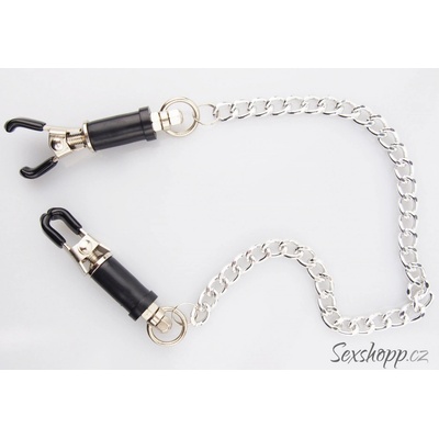 Svorky na bradavky Specifikace produktu: Délka svorky: 8,5 cm Šířka svorky: 3,5 cm Délka řetězu: 30 cm Balení: Přebal (BULK) Další informace: Materiál: Kov Barva: Černá