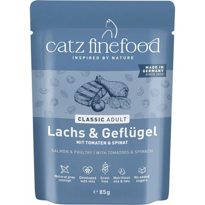 Lahodná konzerva pro kočky, která obsahuje vysoký podíl masa z lososa, jemného drůbežího masa, zdravý špenát a rajčata. Konzervy a kapsičky Catz finefood obsahují pouze...