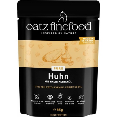 Lahodná konzerva pro kočky, která obsahuje vysoký podíl kuřecího a bažantího masa, zdraví prospěšnou řeřichu a smetánku lékařskou. Konzervy Catz finefood obsahují pouze...