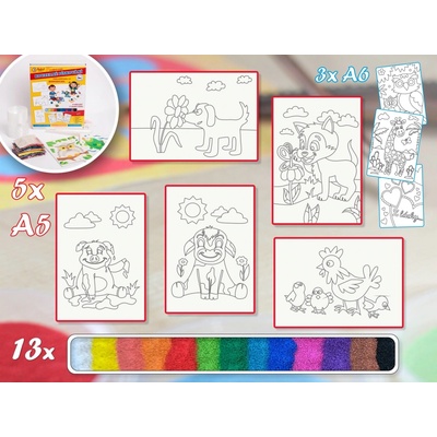 Šablony, dostatek barevného písku (cca pro 20-25 šablon), obaly na šablony, pomůcky a návod pro pískování. Složení obrázků můžete vidět na úvodní fotografii. Šablony jsou vhodně...