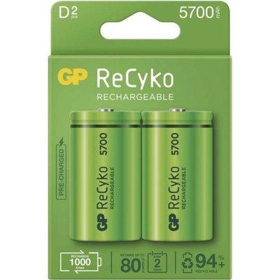 Nabíjecí baterie GP Recyko+ 5700 mAh R20 - Velikost D, velké mono - 1,2 V / 5700 mAh - průměr 34,2 x 61,5 mm - GP ReCyko+ kombinuje výhody NiMH nabíjecích a alkalických...