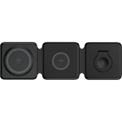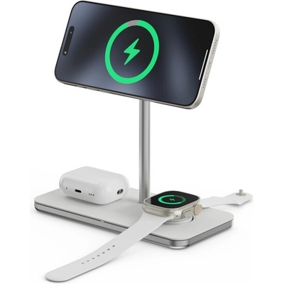 MagSafe skládací bezdrátová nabíječka pro nabíjení tří zařízení současně. Pro nabíjení telefonu s výkonem až 15W, sluchátek a Apple Watch hodinek na integrované vyklápěcí ploše.