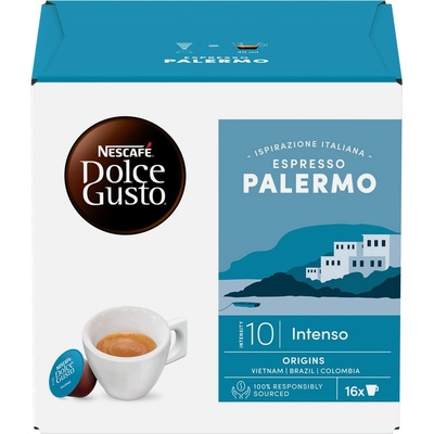 Nescafé Dolce Gusto Espresso Palermo 16 ks kávové kapsle Kávové kapsle Nescafé® Dolce Gusto® Espresso Palermo. Pražená mletá káva s intenzitou 10/13 Balení obsahuje 16 ks hermeticky uzavřených kapslí pro přípravu 16 šálků.