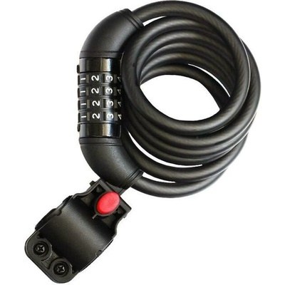 - zámek spirála - ocelové lanko 10 mm - délka 1500 mm - 4místný číselný kód - barva černá - držák na sedlovku - baleno na závěsné kartě