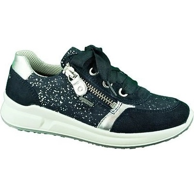 Dívčí kožené botasky Superfit s bočním zipem a šněrováním v elegantní tmavě modré barvě se stříbrným třpytem. Boty s gore-tex membránou nepromoknou a jsou vhodné ke kalhotám i...