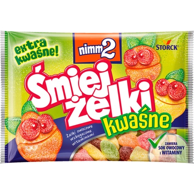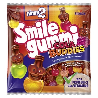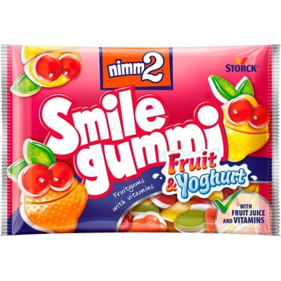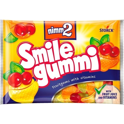 Storck Nimm2 Smile gummi 100 g Ovocné želé obohacené vitamíny. Složení: - Glukózový sirup, cukr, jedlá želatina. - Ovocná šťáva z koncentrátu 5% - hroznové víno, bezinky....