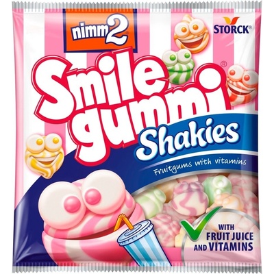 Storck Nimm2 Smile gummi Shakies 90g Ovocné želé s vitamíny a s odstředěným mlékem. Složení: - Glukózový sirup, cukr, zvlhčující látka: sorbitol, sušené odstředěné mléko...