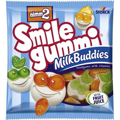 Storck Nimm2 Smile gummi Milk Buddies 90g Ovocné želé s odstředěným mlékem a vitaminy. Složení: - Glukózový sirup, Cukr, Sušené odstředěné mléko (5,5 %). - Jedlá želatina, Ovocná šťáva (5 %) z koncentrátu ovocné šťávy (hroznové víno, černý bez). - Kyseliny...
