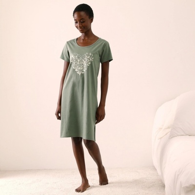 Dlouhá noční košile s potiskem srdcea se postará o Váš sladký spánek. Kulatý výstřih. Krátké rukávy. Vpředu středový potisk květinového srdce. Rovný dolní lem a boční rozparky....