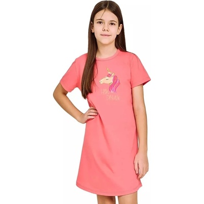 Příjemná noční košile je z bavlněného úpletu. Je meruňkové barvy s obrázkem jednorožce a nápisem ´HIGH DREAM´. Noční košile má krátký rukáv a kulatý...