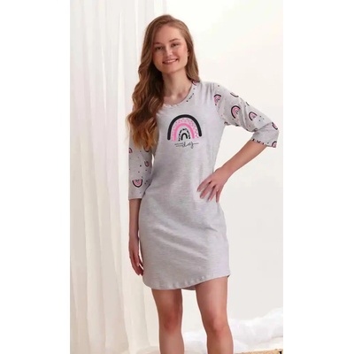 Noční košile klasického střihu s dlouhým rukávem. Rukávy ve 3/4 délce. Délka košilky ke kolenům a zakončení mírně dokulata. Světle šedý melír zdobí na rukávech a předním díle...