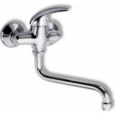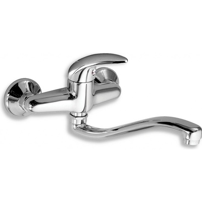 Páková nástěnná dřezová baterie s otočným ramínkem. V oblém designu. V chromovém provedení. Rozteč baterie 150 mm.