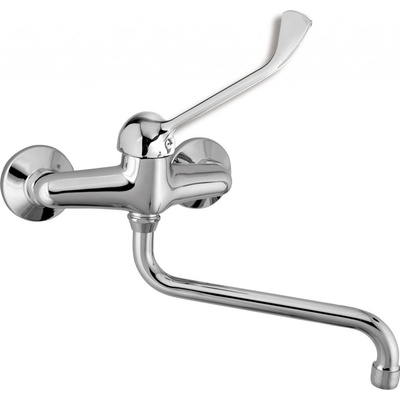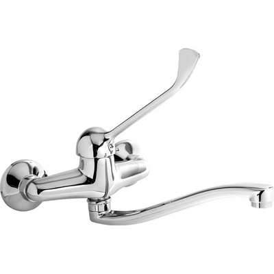 Nástěnná dřezová nebo umyvadlová baterie, rozteč 150 mm, provedení Chrom, lékařská páčka.Součástí baterie je kompletní příslušenství k montáži. Není třeba nic dokupovat.