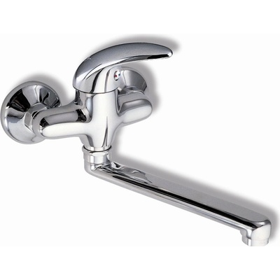 Páková nástěnná dřezová baterie s otočným ramínkem. V oblém designu. V chromovém provedení. Rozteč baterie 150 mm.