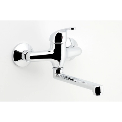 Páková nástěnná dřezová baterie s otočným ramínkem. V oblém designu. V chromovém provedení. Rozteč baterie 150 mm.