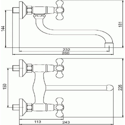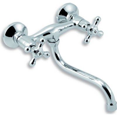 Kohoutková nástěnná dřezová baterie s otočným ramínkem. V retro designu. V chromovém provedení. Rozteč baterie 150 mm.