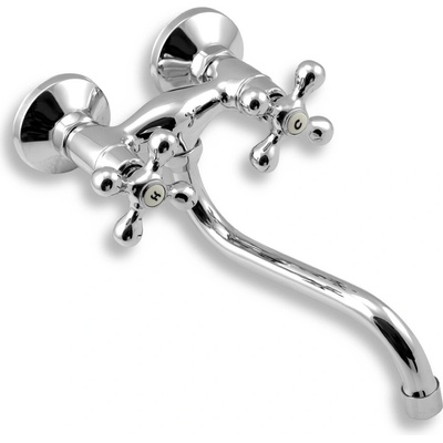 Kohoutková nástěnná dřezová baterie s otočným ramínkem. V retro designu. V chromovém provedení. Rozteč baterie 100 mm.