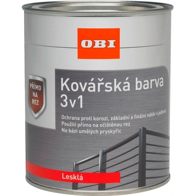 OBI Kovářská barva 3v1 OBI kovářská barva 3v1 na bázi umělých pryskyřic je určena pro ochranné a dekorativní nátěrů kovů proti korozi. Lze ji použít na železo a ocel jako...