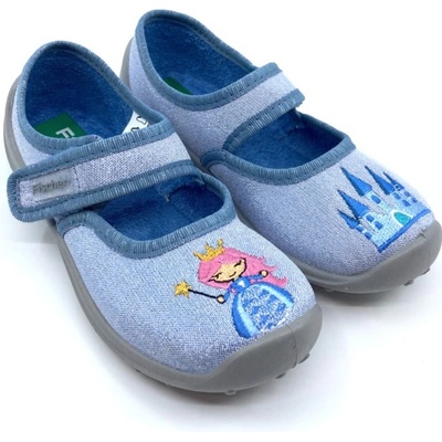 Textilní dívčí baleríny Fischer 642370 ve světle modré barvě s motivem ledového království - princezny a zámku v kombinaci s šedou podrážkou. Podšívka je z modrého, bavlněného...