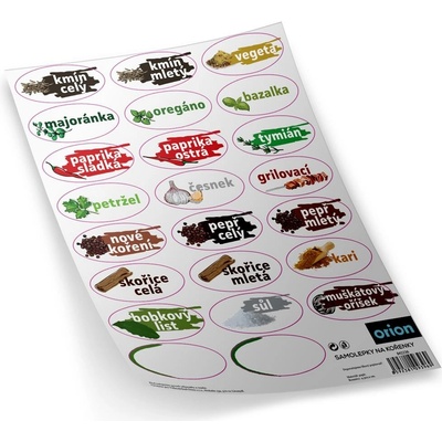 Samolepky na koření. Oválný tvar. 21 samolepek s popisem, 2 prázdné. Rozměry: 1 samolepka 4,3x2,2 cm, rozměr archu 14,3x21 cm.