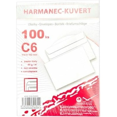Bílé obálky rozměru 114 × 162 mm, vyrobeny z bezdřevého papíru, 80 g/m2. Samolepicí. Formát: C6 Balení: 100 ks