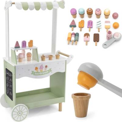 Velká dřevěná pojízdná prodejna zmrzlin. Balení obsahuje dřevěnou prodejnu, dřevěné zmrzliny, dřevěné nanuky, dřevěné kornoutky, dřevěné kleště na nabírání zmrzliny, dřevěnou...