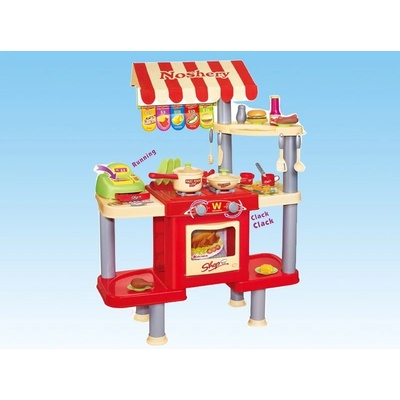 Multifunkční hrací stoleček se stříškou, závěsem, policemi a tabulkami na křídy. Součástí je i malá popisovací tabulka. Bedýnky s potravinami součásti nejsou, lze je dokoupit....