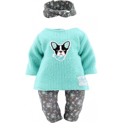 Obleček určený zejména pro panenky Petitcollin řady Petit Câlin. Skládá se ze vzorovaných tepláčků tyrkysového svetříku s motivem pejska a vzorované čelenky. Oblečky Petitcollin...