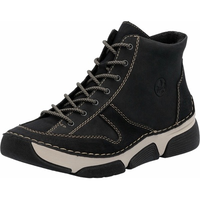 Dámské kotníkové boty značky Rieker. Ležérní styl v designu surové kůže v černé barvě je doplněn výrazným šitím a ozdobnými stehy v béžové barvě. Na vnější straně je vyražené...