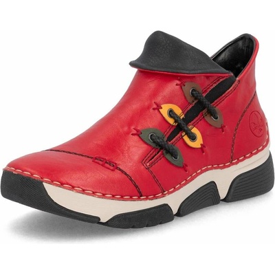 Dámské polobotky značky Rieker. Svižný model v moderním dynamickém stylu. Svršek je vyroben v designu hladké kůže ve veselé červené barvě. Výrazné šití v béžové barvě...