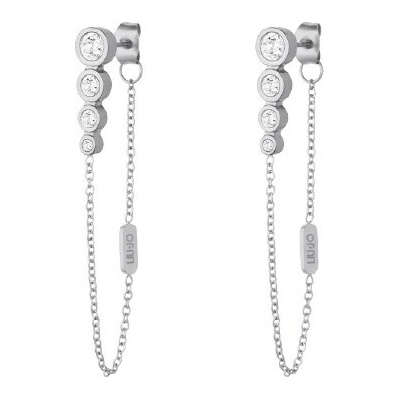 Náušnice z 316L oceli, malá lesklá kulička, zdvojení motýlci, tři krátké řetízky, puzetové zapínání.
