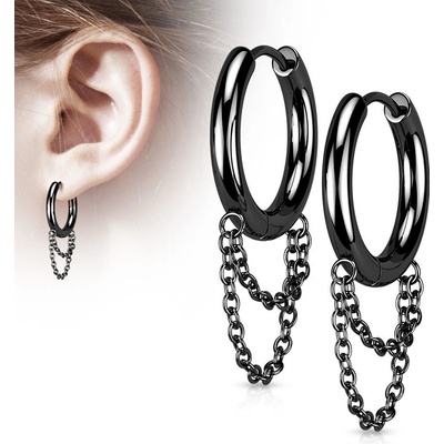 Ocelové náušnice kroužky zdobené zavěšenými řetízky.Náušnice jsou vyrobeny z chirurgické oceli s jakostním označením 316L v černé povrchové úpravě.