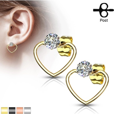 Ocelové náušnice v podobě tenké kontury srdce s čirým kulatým broušeným zirkonem v kotlíku, puzetové zapínání.