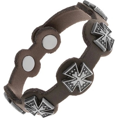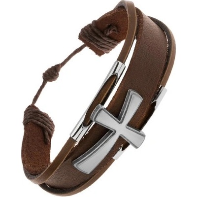 Tmavohnědý nastavitelný multináramek z kůže, kovová aplikace v podobě vypouklého kříže, lesklé rourky s výřezy.