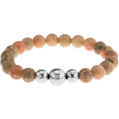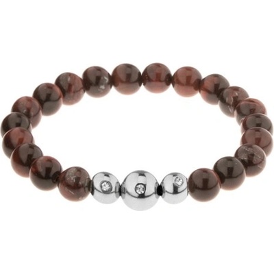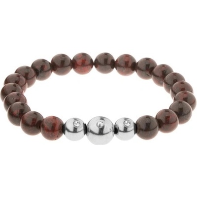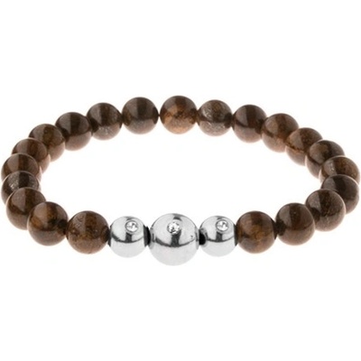 Náramek z přírodního kamene hnědé a černé barvy a z ocelových kuliček navlečených na pevné gumičce.