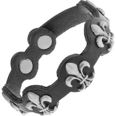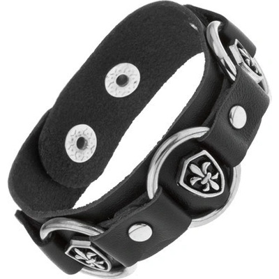 Nastavitelný kožený náramek černé barvy, pět spojených kruhů s patinovanými symboly královské lilie.