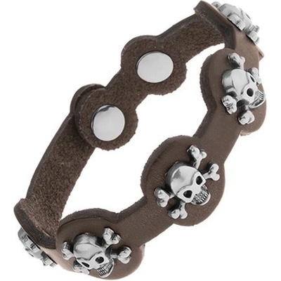 Tmavě hnědý kožený náramek na ruku, pět spojených kruhů s patinovanými lebkami z oceli, nýty, nastavitelná délka.