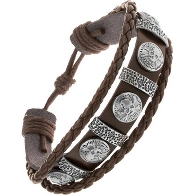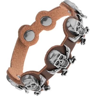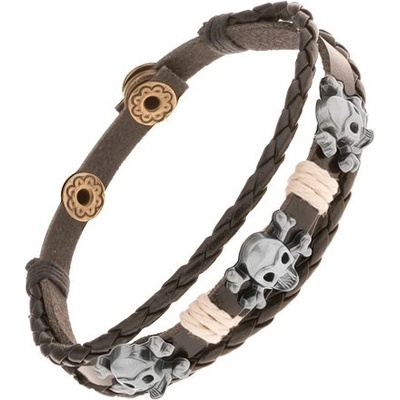 Náramek na ruku - tmavohnědý kožený pás se třemi ocelovými lebkami a se šňůrkou béžové barvy, dva zapletené pásky.