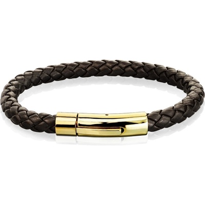 Kožený náramek v tmavě hnědém provedení, propletený vzor, ocelová spona na zapínání ve zlatém barevném provedení.
