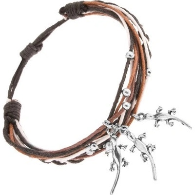 Náramek z černých, bílých a hnědých šňůrek, copánkový vzor, ocelové kuličky a tři přívěsky - lesklé ještěrky stříbrné barvy.