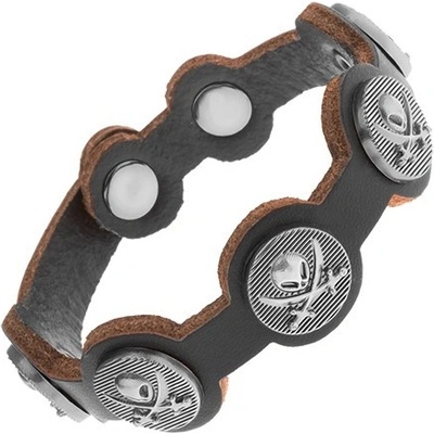 Kožený náramek na ruku, pět spojených kruhů s patinovanými lebkami z oceli, nýty, nastavitelná délka.