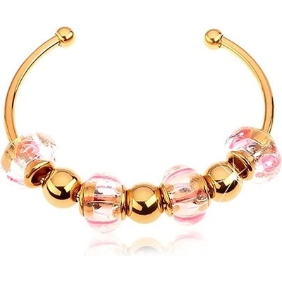 Neuzavřený náramek z oceli 316L ve zlatém odstínu s růžovo-čirými skleněnými a ocelovými korálky.