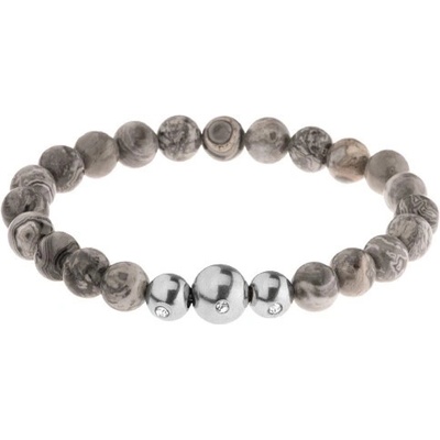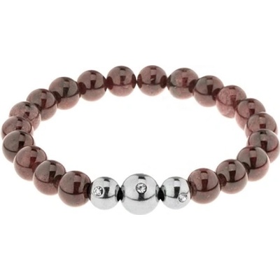 Náramek v podobě lesklých kulatých kamínků a tří korálků z oceli se zirkony, pružná gumička.