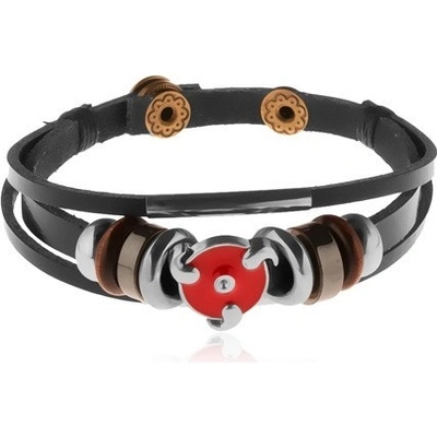 Náramek na zápěstí - černé kožené pásy s navlečenými korálky z kovu a ze dřeva, kruh zdobený červenou glazurou.